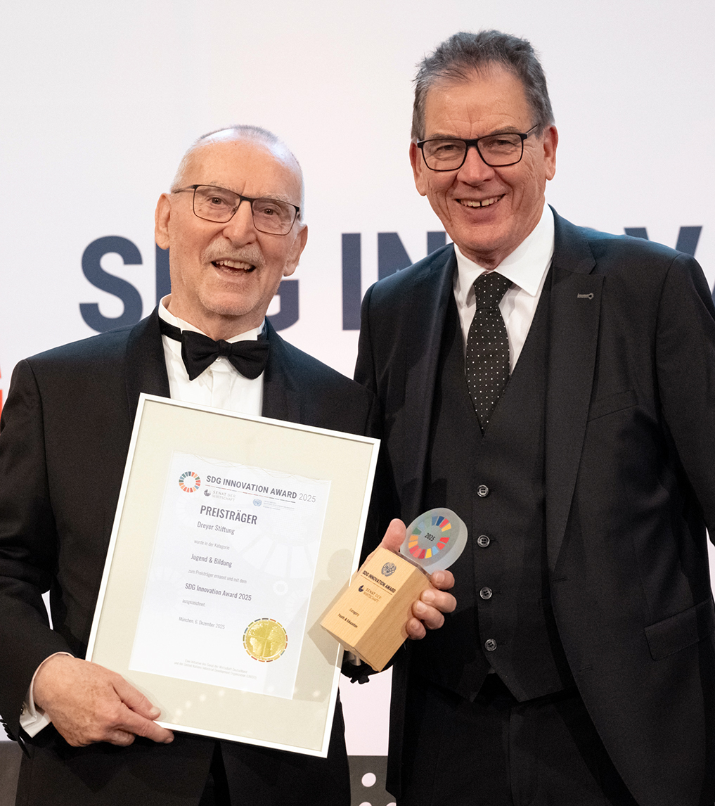 Am 06.Dezember 2025 fand im Bayrischen Landtag in München die feierliche Preisverleihung des SGD Innovation Award 2025 statt, den die UNIDO und der Senat der Wirtschaft Deutschland jährlich ausschreibt. Die Dreyer Stiftung erhielt unter den vielen internationalen Nominierten diesen Preis.