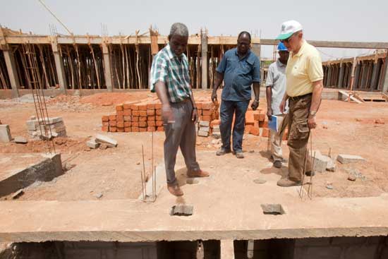 Gisbert Dreyer begutachtet mit Architekt Formouzere Zala (l.) die Baustelle der entstehenden école maternell in Dano. Mit diesem Projekt bietet die dreyer stiftung ab Ende 2010 270 Kindern die Möglichkeit auf eine frühkindliche Bildung.